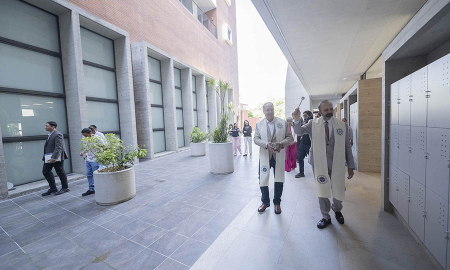 “Esta es la capilla, aquí en el centro va a estar un altar”, explica Alexander Zatyrka, SJ, rector del ITESO, a la comitiva que le acompaña mientras camina, mete el hisopo en el acetre para luego rociar con agua bendita los espacios del Edificio Poniente, así como a las personas que van siguiendo sus pasos. El cortejo avanza por el lobby, el ágora, los pasillos y los salones que dentro de pocos días se verán poblados por estudiantes y docentes de la Prepa ITESO, educación continua y posgrados, principalmente, pero también por toda la comunidad universitaria. El nuevo edificio del campus está listo para ser habitado por sus protagonistas: las personas.