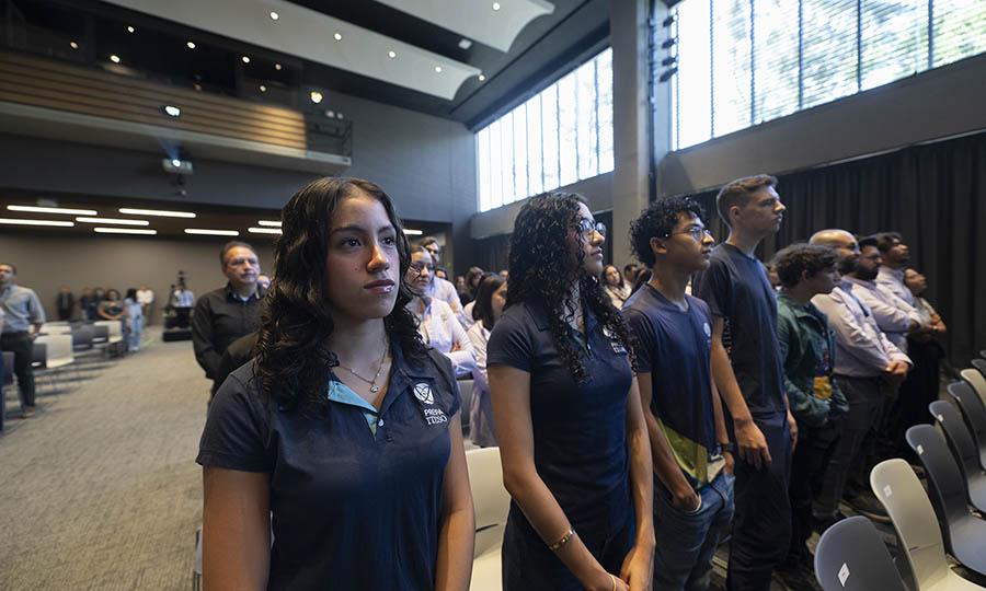 Es martes y todavía se sienten los efectos de la lluvia de la noche anterior. En el nuevo auditorio están congregadas autoridades del ITESO, de la Compañía de Jesús, así como representantes de gobierno y de la comunidad universitaria. La ceremonia para inaugurar el nuevo edificio del campus es conducida por Mónica Durán Labrador, directora de la Prepa ITESO, y por Carlos Araujo, exdirector del bachillerato y actual director de la Oficina de Educación Continua. Ceden la palabra a Guillermo Gatt Corona, quien, dice, da la bienvenida a las y los asistentes “como presidente de ITESO, AC, pero también como egresado y profesor”. Después menciona que con la apertura del nuevo edificio el campus se consolida como uno “de los mejor equipados, seguros y sostenibles de México”. El diseño del arquitecto Javier Díaz, dice Gatt Corona, “es un orgullo como itesianos y como jaliscienses”.