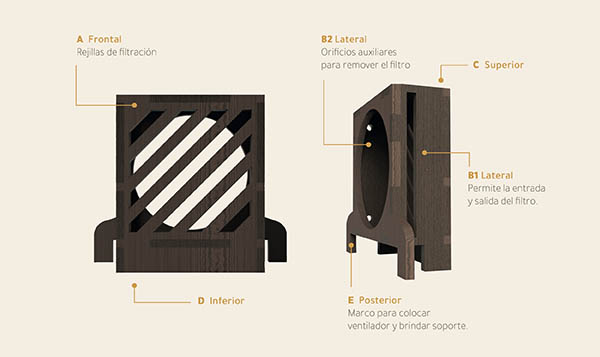 El sistema consta de un filtro que absorbe partículas mayores a 0.3 micrones y un ventilador de 12 pulgadas que opera con un motor de tres velocidades y filtra hasta 50 metros cúbicos de espacio (el tamaño estándar de un salón de clases). Se fabrica con triplay de caobilla o pino de 18 milímetros, un material accesible y de fácil transformación que permitiría a los carpinteros reactivar su economía.