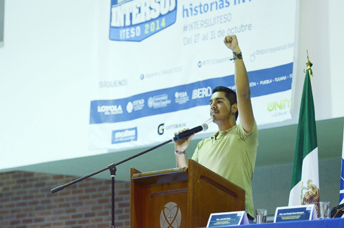 El júbilo del recinto se silenció cuando se escuchó en la voz de Óscar Juárez, estudiante de la Licenciatura en Ciencias Políticas y Gestión Pública del ITESO, "hoy en este justa deportiva hay un equipo ausente de 43 compañeros desaparecidos".