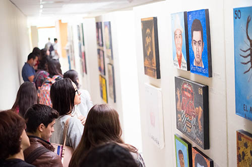 La presentación de Reflexiones sobre Ayotzinapa en la perspectiva nacional sirvió como marco para inaugurar, en el pasillo de la planta alta de la Biblioteca Dr. Jorge Villalobos Padilla, SJ, la exposición Lotería 43, que reúne obra plástica y literaria de diferentes creadores. José Santos Urbina, coordinador de la muestra, señala que ésta tiene por objetivo "mantener viva la memoria a través del arte".